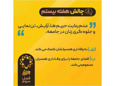 به گزارش روابط عمومی برنامه تلویزیونی چراغ، سی و نهمین و چهلمین قسمت فصل سوم برنامه چراغ یکشنبه ۱۴آذر و سه شنبه۱۶ آذر ماه بروی آنتن شبکه ۵ سیما می رود. طبق روال فصل سوم برنامه که هر هفته یکی از چالش ها و مسائل جدی شبکه مسائل عفاف و حجاب مورد بررسی قرار می گیرد، این هفته نیز برنامه چراغ چالش جدیدی را مورد بررسی قرار داده که سوال نظرسنجی برنامه هم محسوب می شود و عبارتست از: