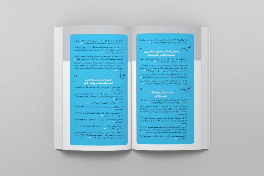 از دیگر ویژگیهای این کتاب فصل بندی آن است که بر اساس نوع جهانبینی و میزان اعتقاد به اسلام در مخاطب که بسیاری از سوالاتش ریشه در پرسش اصلیتر و مبناییتر دارد و در واقع تکرار چند مفهوم اصلی صورت گرفته است.