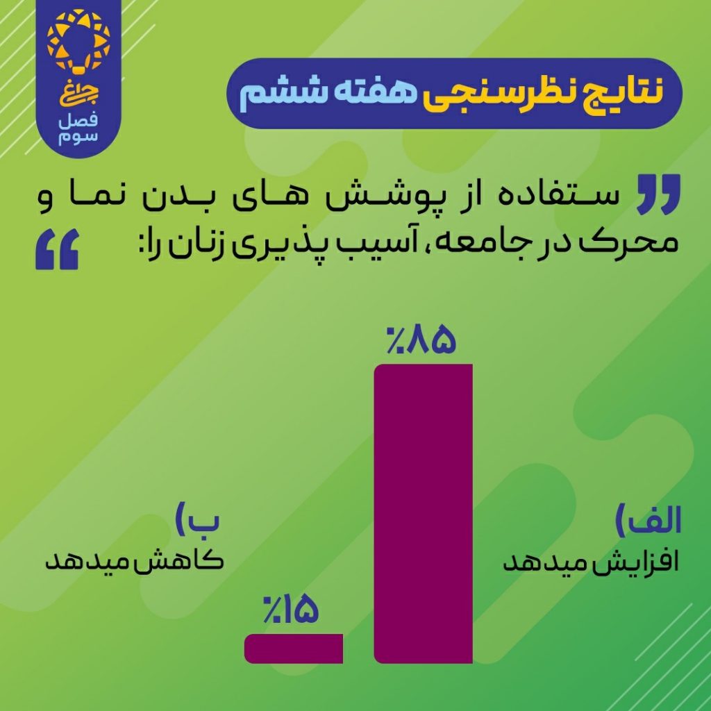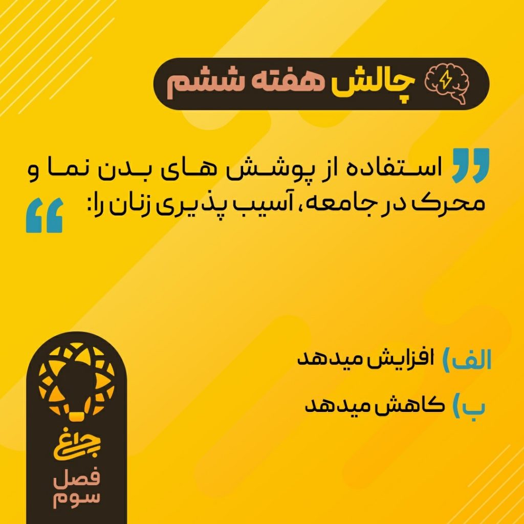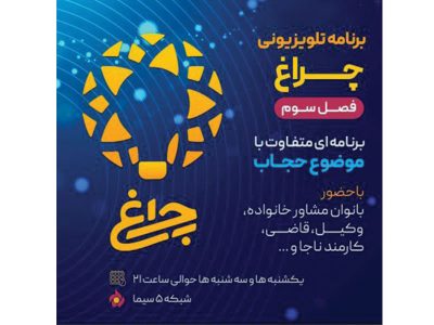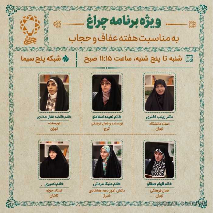 “چراغ”، برنامهای تلویزیونی با محوریت کارکردهای حجاب هست که تا کنون ۳ فصل از آن روی آنتن شبکه پنج سیما رفته است. در فصل اول و دوم این برنامه، به روایت موثر فعالان عفاف و حجاب در سراسر کشور پرداخته است و در فصل سوم قرار است به موضوعاتی از قبیل رعایت حجاب و حریم زن و مرد و آسیب های عدم رعایت با طراحی چالش و سوال پرداخته شود. مهمانان این فصل مشاوران، وکلای دادگستری و… هستند.