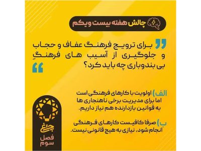 به گزارش روابط عمومی برنامه تلویزیونی چراغ، چهل و یکمین و چهل و دومین قسمت فصل سوم برنامه چراغ یکشنبه ۲۱ آذر و سه شنبه ۲۳ آذر ماه بروی آنتن شبکه ۵ سیما می رود. طبق روال فصل سوم برنامه که هر هفته یکی از چالش ها و مسائل جدی شبکه مسائل عفاف و حجاب مورد بررسی قرار می گیرد، این هفته نیز برنامه چراغ چالش جدیدی را مورد بررسی قرار داده که سوال نظرسنجی برنامه هم محسوب می شود و عبارتست از: